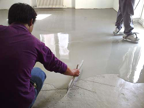 3、水泥自流平面層:將液體添加劑倒入干凈的攪拌容器中,然后按比例一邊 攪拌一邊加入自流平粉料,充分攪拌成無生粉團的、均勻的膠條,用鏝刀將調配好水泥自流平材料均勻饅涂在底漆上,干燥時間為24-48小時化;